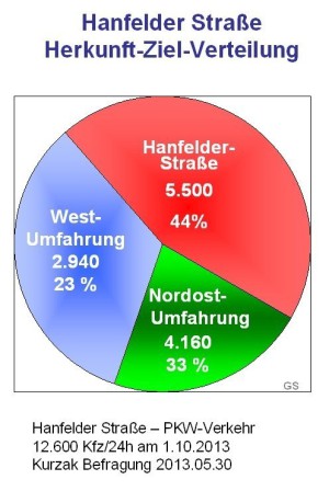 Ein Drittel der Mobilisten am Kreisel der Hanfelder Straße würden gerne nach Nordosten fahren. Geht aber nicht, solange es keine Nordost-Umfahrung gibt. Wie will man die PKWs auf die West-Umfahrung zwingen und dann beim Maxhof rückwärts durch die Stadt nach Osten? Absurdes Verkehrskonzept: Mit der Kirch ums Dorf fahren!